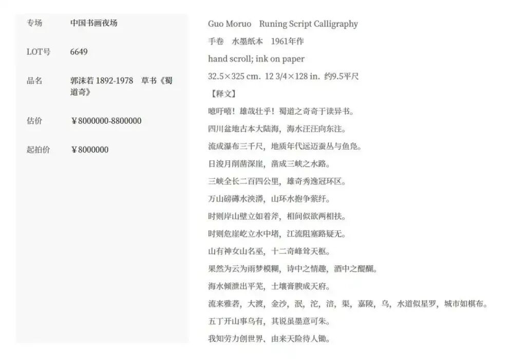 近日,郭沫若书道手卷《蜀说念奇》将亮相北京保利二十周年秋拍,12月16日开拍,起拍价800万元。其女郭庶英交付讼师发布声明,称该作品为父亲1961年题赠我方的私藏,从未转让或授权,现在已遗失并报警,质疑拍卖为无权刑事包袱,条目保利中止拍卖、返还作品。