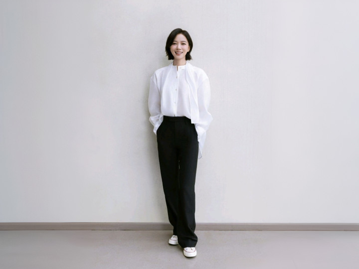 临了压轴的灰套装,径直封神了!灰色上衣口角拼接,领口挺括,头发利落盘起,戴耳饰和腕表,配景深蓝配灰幕布,高等感扑面而来!这哪是上班,分明是拍大片,质感满满,看得我心痒痒,恨不得立马脱手同款。