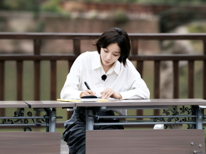 再来另孤单,雷同是白衬衫,但领口规规定矩,配上深色格子阔腿裤,坐在户外写东西,胸前别个小麦克风,专科范儿拿抓得死死的!这造型从简吧?可气质嗖嗖往高潮,干活皆带风,谁能不爱?